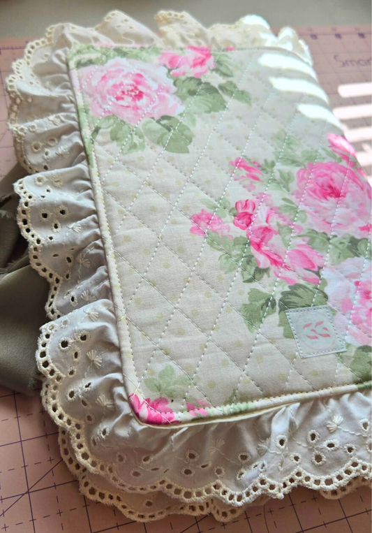 Pink Floral Quilted Bible Cover with Lace Trim and Satin Bow – Feminine Bible Case, Gift for Her